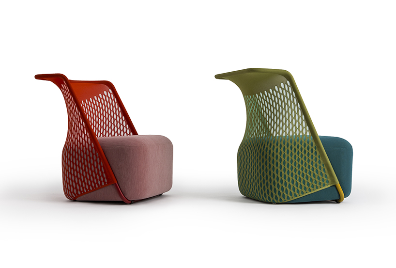 “cradle”座椅采用了layer工作室與一家?jiàn)W地利工廠(chǎng)聯(lián)合創(chuàng)作的幾何圖案織物。這種針織材料具有高強(qiáng)度和低密度等特性,為就座者提供靈活的支持。金屬靠背包含著軟墊座位,形成一個(gè)環(huán)狀弧度與座椅結(jié)構(gòu)下方相連接。作品設(shè)計(jì)實(shí)現(xiàn)了一個(gè)又高又有些偏小的包覆輪廓,為人們提供了吊床般的獨(dú)特舒適感,同時(shí)又省去了來(lái)回攀爬的麻煩。